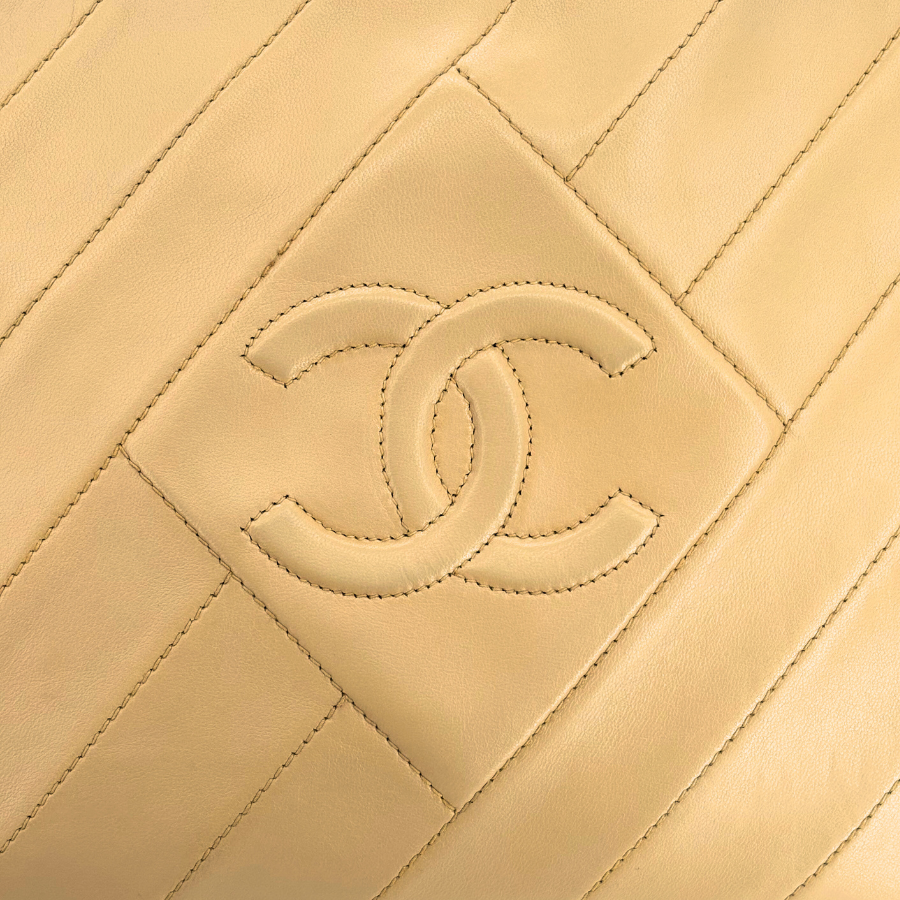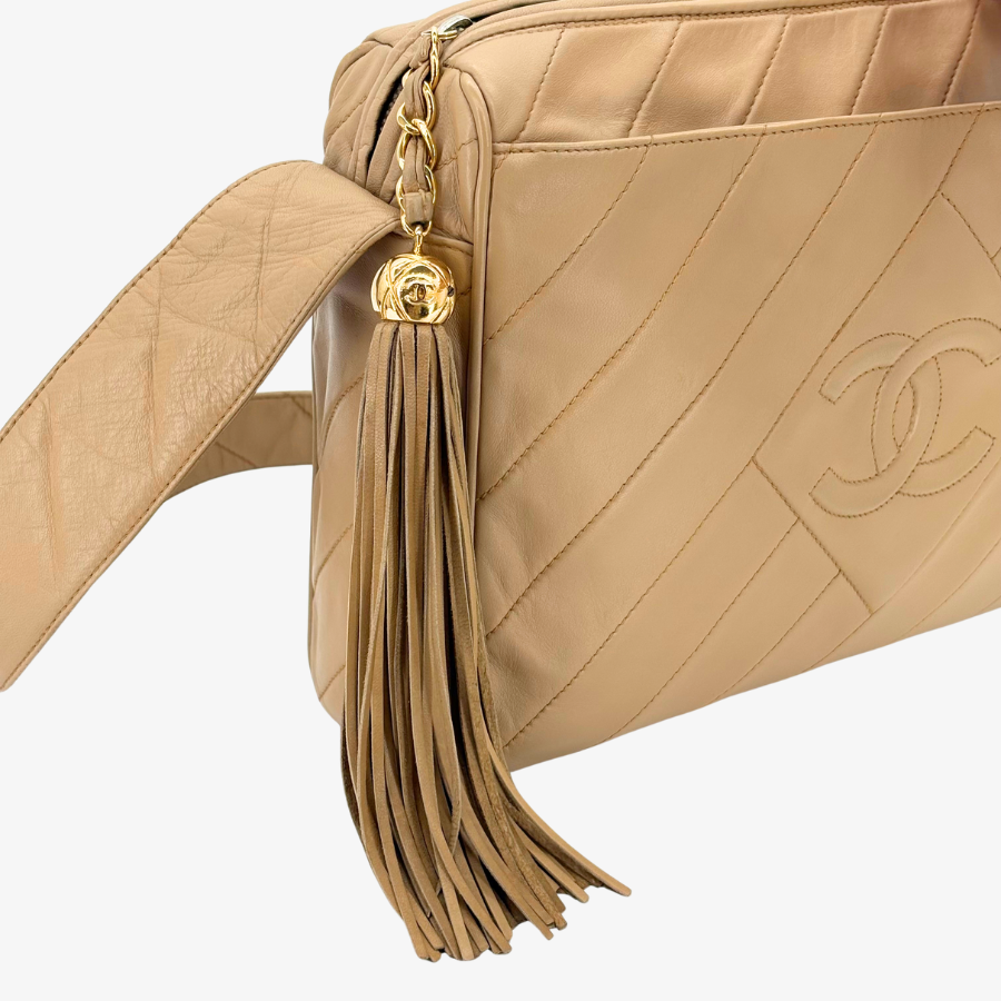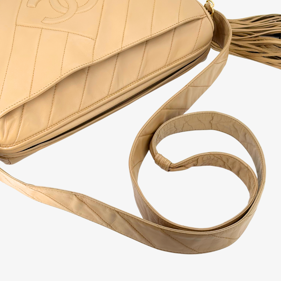 JZ752 - CHANEL Vintage Beige Lambskin Diagonal Stich CC Tassel Camera Bag