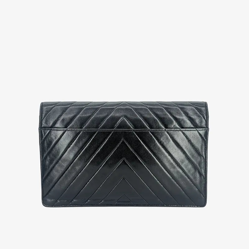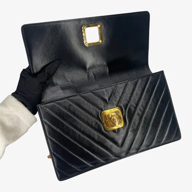 RC469 - CHANEL Vintage Black Lambskin Chevron Push Lock Flap Bag