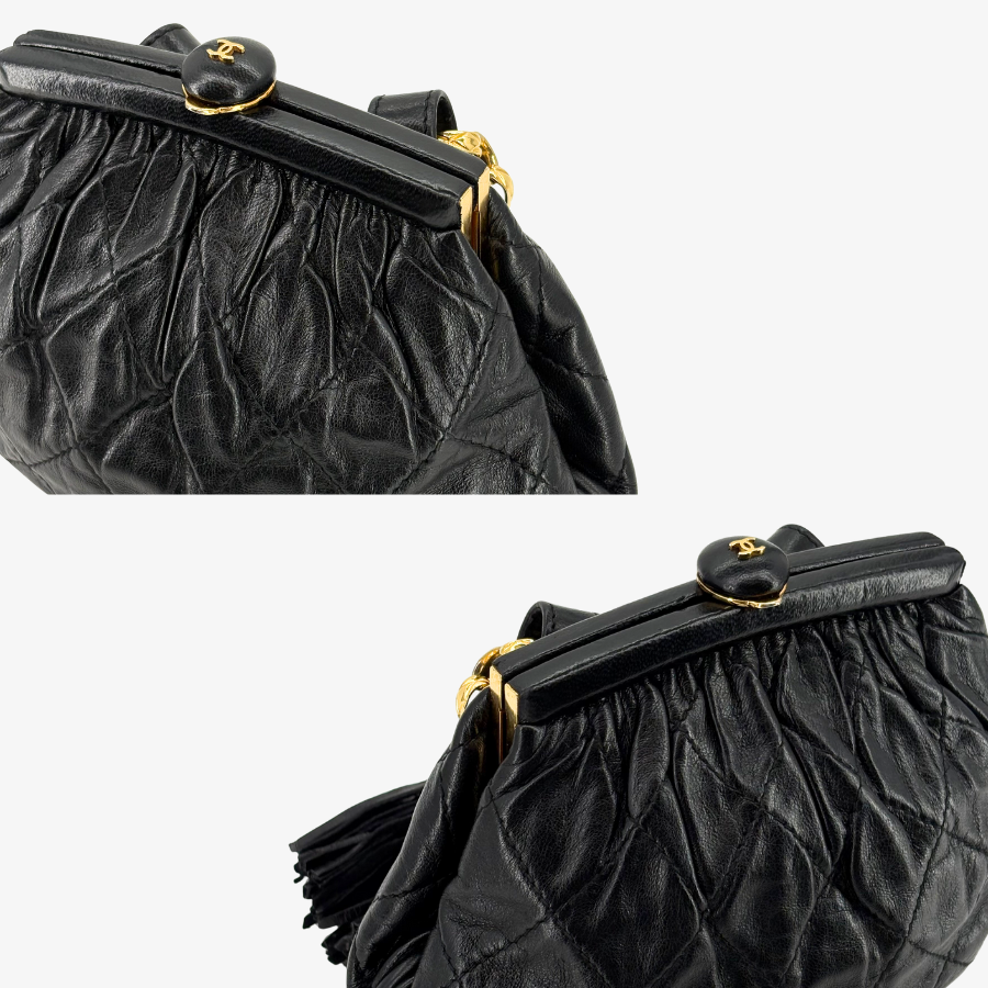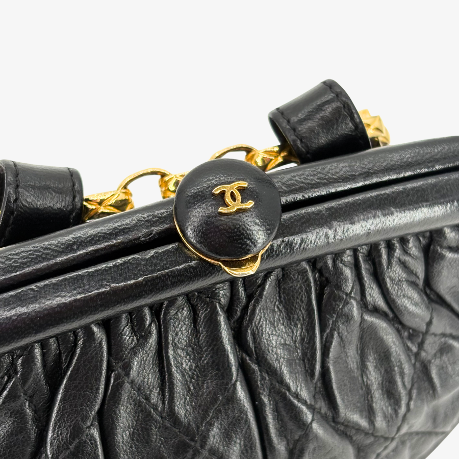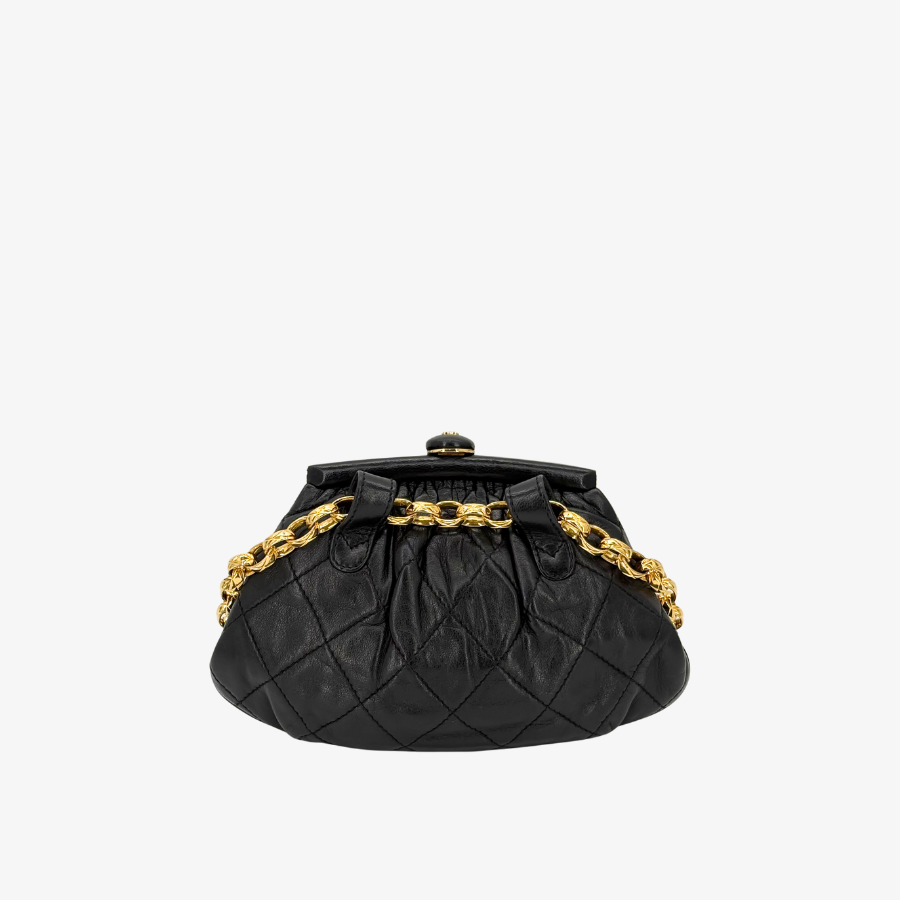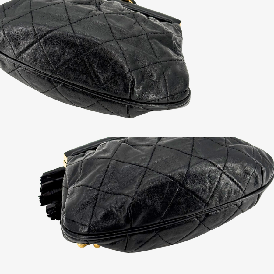 JZ516 - CHANEL Vintage Black Lambskin Gold Chain Waist Pouch Clasp Bag