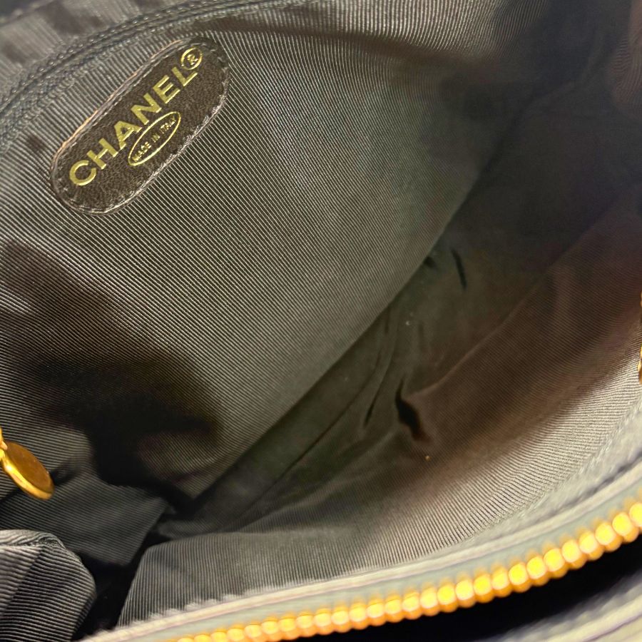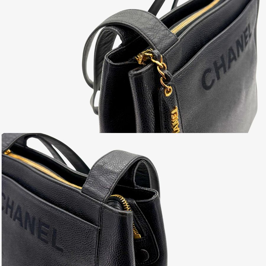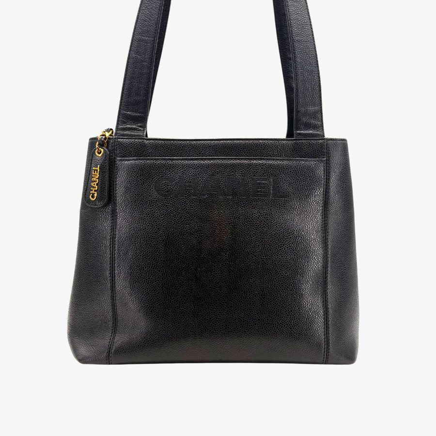 CS066 - CHANEL Vintage Black Caviar Leather Embroidered Logo Tote Bag