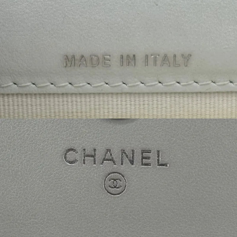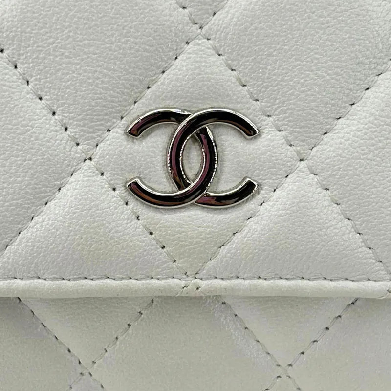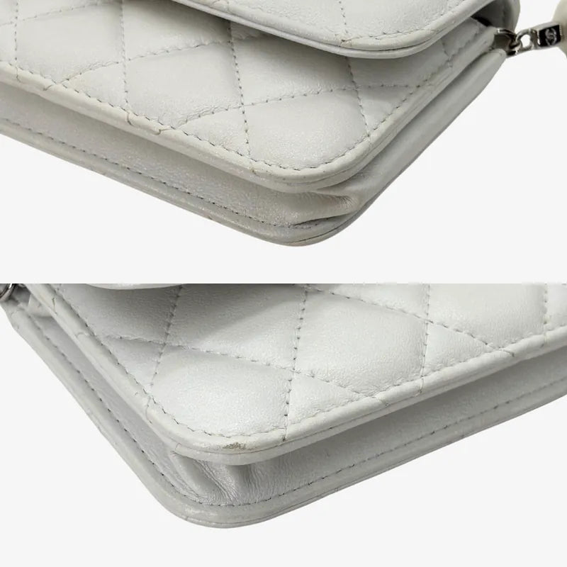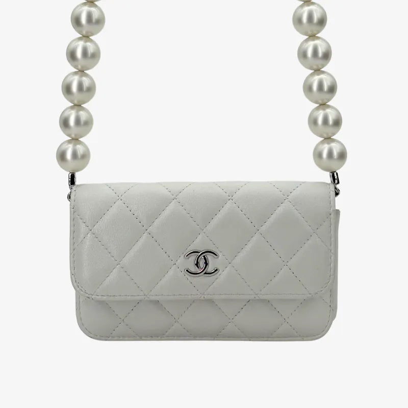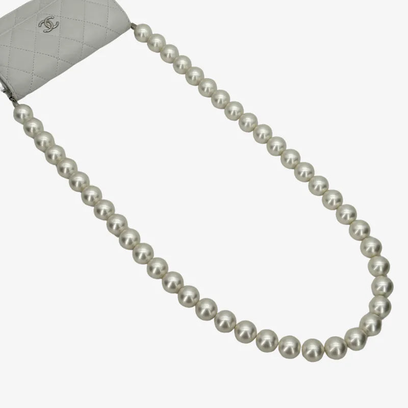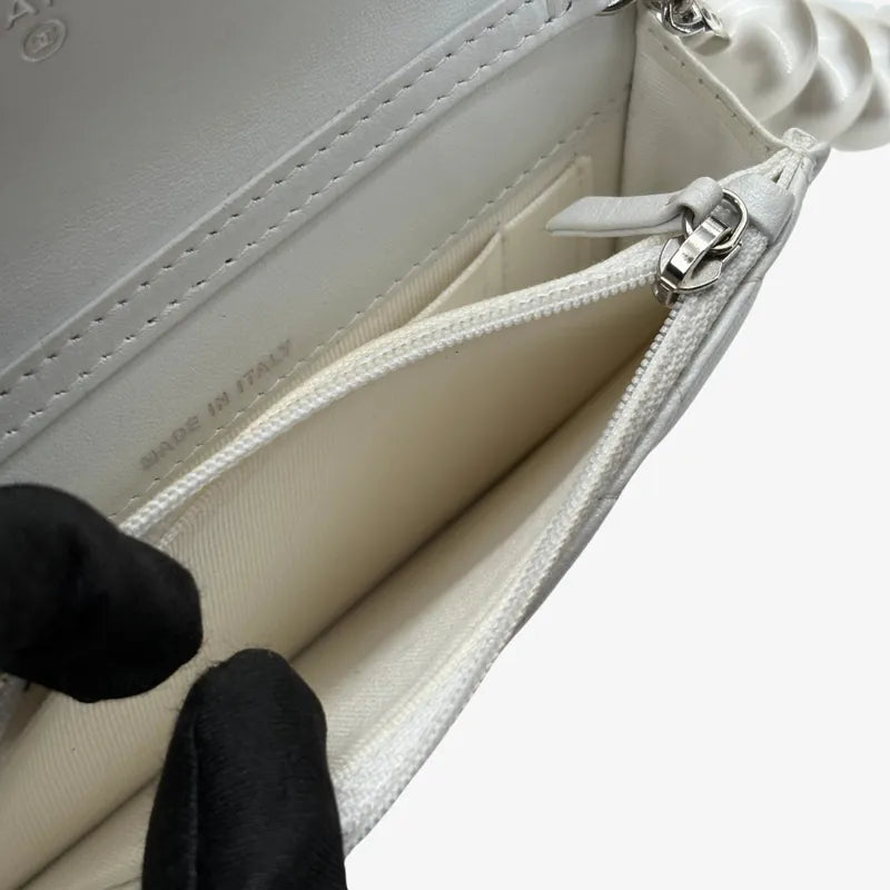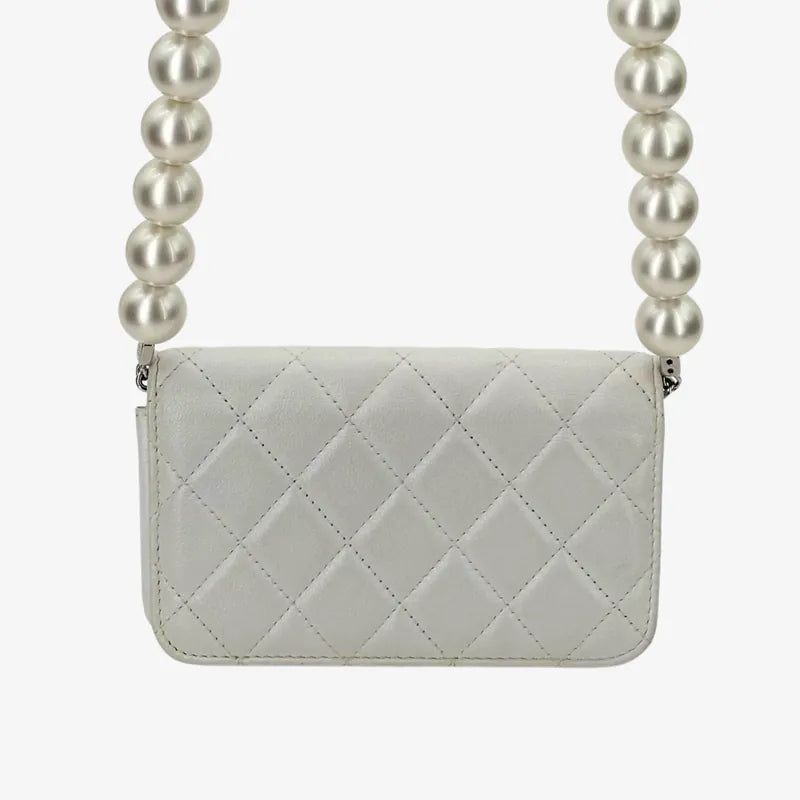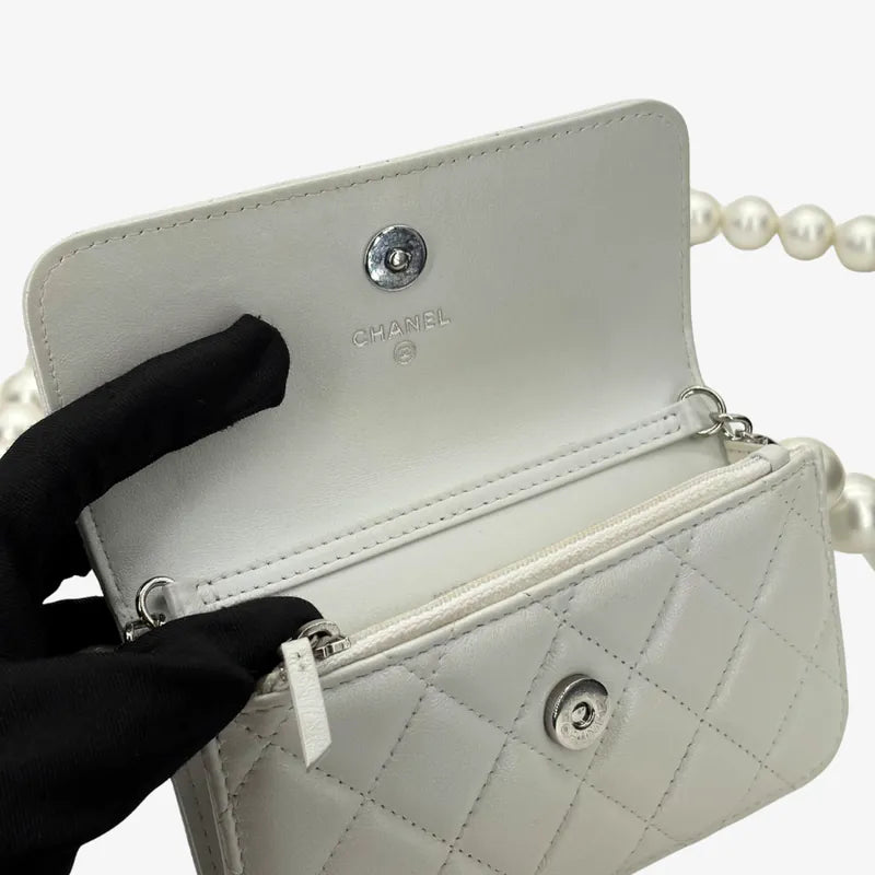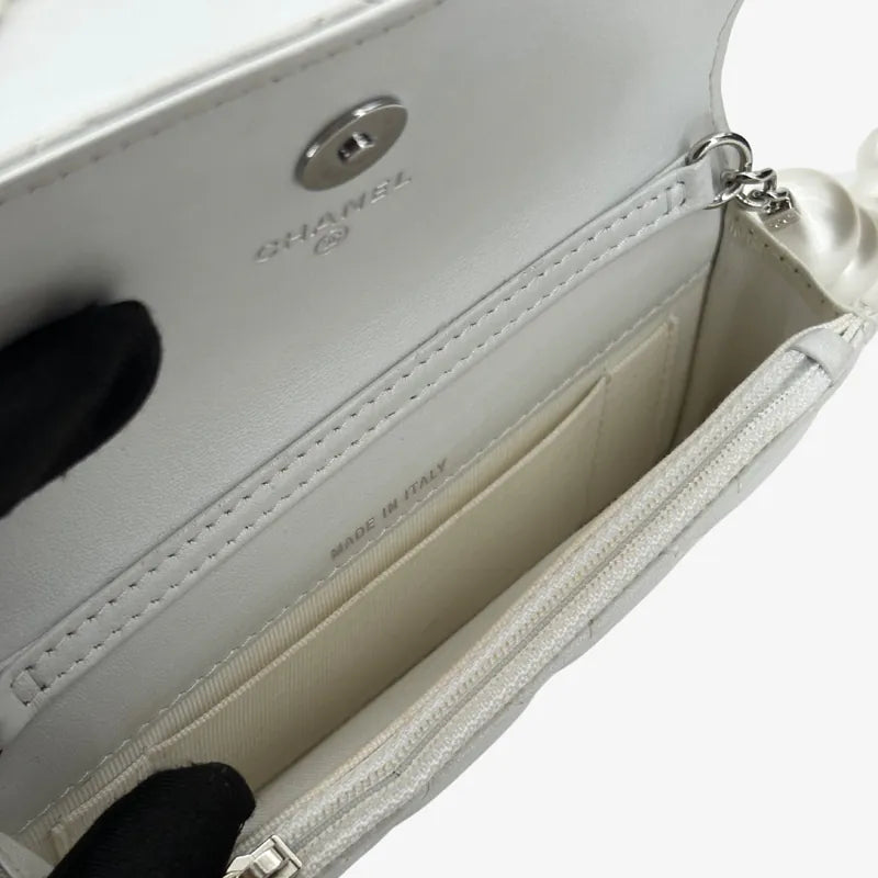 C626 - CHANEL White Calfskin Quilted Clutch With Imitation Pearl Chain